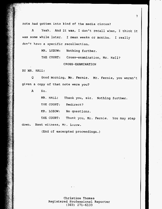 | John Fernie and his wife, Barbara were called by Patsy Ramsey the morning of December 26, 1996 shortly after Patsy called 911 to report JonBenet Ramsey had been kidnapped. Three and a half years later, John Fernie was subpoenead to testify in the trial of the State of Colorado vs Thomas C. Miller, who was accused of conspiring to help Craig Lewis purchase a copy of the ransom note for $30,000 for the Globe. John Fernie, "I drove my car into the -- up the alley and parked in the back of your house, and went around to the patio door, which was a glass door leading into the kitchen and back of the house, and didn't see anybody, but saw a piece of paper laying on the floor. Looked at that. It was facing the other direction. Read it. And after the first few lines realized something very strange was happening. And so I ran around to the front of the house and knocked on the door and was let in." John Fernie: "I didn't pick it up. It was inside the door and I was outside. The door was locked. I read it through the door." John Fernie: "Fleet and Priscilla White were there when I arrived. And my wife came shortly thereafter. And our -- Overstock, our priest, came afterwards as well." John Fernie: "My recollection is that later in the day, when we were waiting for phone calls from the supposed kidnappers, we were sitting in the back room with a detective and trying to figure out what the note meant. And there was a copy of the note. I don't know if it was the note, or a copy of the note, actually." During the testimony, John Fernie stated he was not given a copy of the note. | |