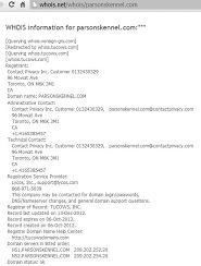 (Excerpt from interview or article) - (http://whois.net/whois/ 10/11/12): http://whois.net/whois/parsonskennel.com Registrant: Contact Privacy Inc. Customer 0132430329 96 Mowat Ave Toronto, ON M6K 3M1 CA Domain name: PARSONSKENNEL.COM Administrative Contact: Contact Privacy Inc. Customer 0132430329, parsonskennel.com@contactprivacy.com 96 Mowat Ave Toronto, ON M6K 3M1 CA +1.4165385457 Technical Contact: Contact Privacy Inc. Customer 0132430329, parsonskennel.com@contactprivacy.com 96 Mowat Ave Toronto, ON M6K 3M1 CA +1.4165385457 Registration Service Provider: Lycos, Inc., support@lycos.com 866-971-5039 This company may be contacted for domain login/passwords, DNS/Nameserver changes, and general domain support questions. Registrar of Record: TUCOWS, INC. Record last updated on 13-Dec-2012. Record expires on 06-Oct-2013. Record created on 06-Oct-2012. Registrar Domain Name Help Center: http://tucowsdomains.com Domain servers in listed order: NS1.PARSONSKENNEL.COM 209.202.252.20 NS2.PARSONSKENNEL.COM 209.202.254.20 Domain status: ok |
