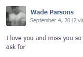 (Excerpt from interview or article) (www.facebook.com) https://www.facebook.com/wade.parsons.9 Wade Parsons Tuesday, September 4, 2012 at 8:46pm via mobile I love you and miss you so much baby. Best friend and wife all in one a guy could ask for Kayla Parsons https://www.facebook.com/kayla.parsons.526 I love you and miss you baby your the best thing that has ever happened to me. I wish you were here with me Tuesday, September 4, 2012 at 9:09pm via mobile |