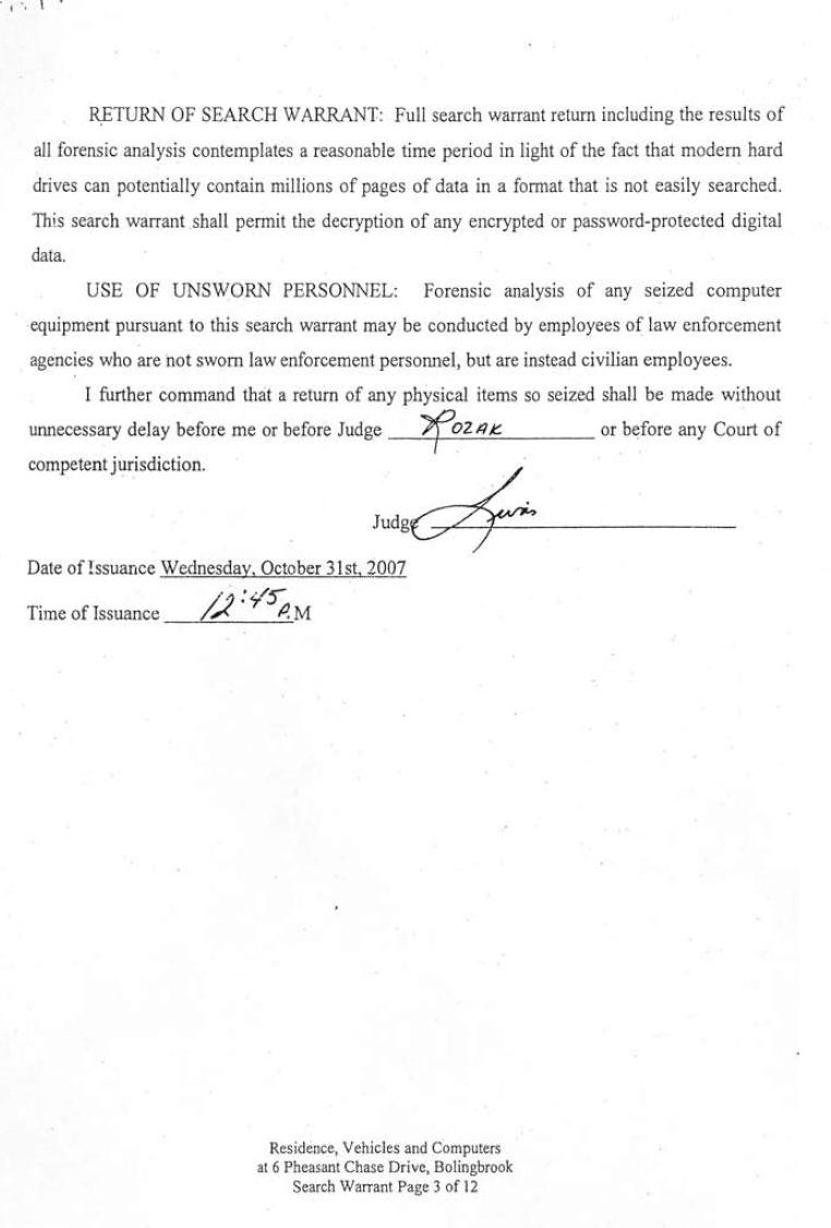 Search Warrant, Date of Issue 10/31/2007 12:45 PM (Signed by Judge) People of the State of Illinois vs The vehicles, computers and residence of Drew W. Peterson, 6 Pheasant Chase Court, Bolingbrook, Will County, Illinois. "be searched and that the following described instruments, articles, and things which have been used in the commission of, or which constitute evidence of the offense of First Degree Murder (720 ILCS 5/9-1(a)(1)) or Concealment of a Homicidal Death (720 ILCS 5/9-3.1(a)) be seized, searched and forensically analyzed:" [10/31/2007 Warrant Transcript by www.acandyrose.com] |